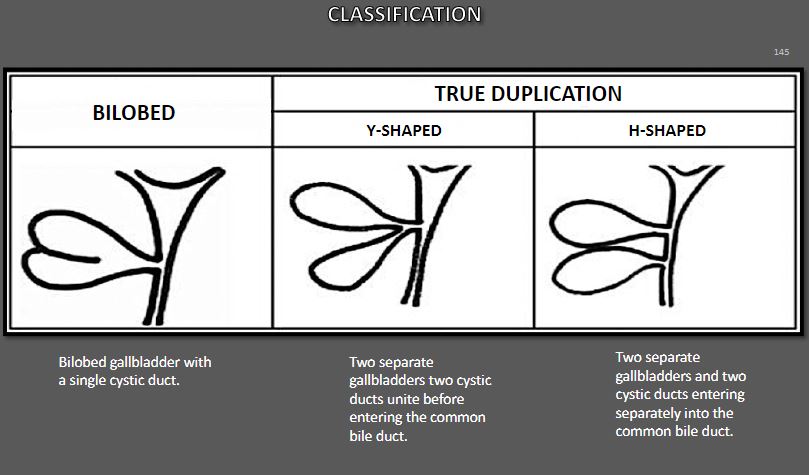 Duplication occurs at the earliest stage of gallbladder development when it splits during the fifth to sixth weeks of embryogenesis to form a double gallbladder or when extra budding forms an accessory organ. Because gallbladder duplication may present in different ways, several classifications have been proposed in the literature. One classification divides the anomaly into two main groups: 1) bilobed gallbladder with a single cystic duct and 2) two separate gallbladders and two separate cystic ducts (true duplication). True duplication is more common and is sub-classified into H-shaped and Y-shaped types. H-shaped type entails two separate gallbladders and two cystic ducts entering separately into the commonbile duct. In contrast, Y-shaped type duplication is seen when two cystic ducts unite before entering the common bile duct