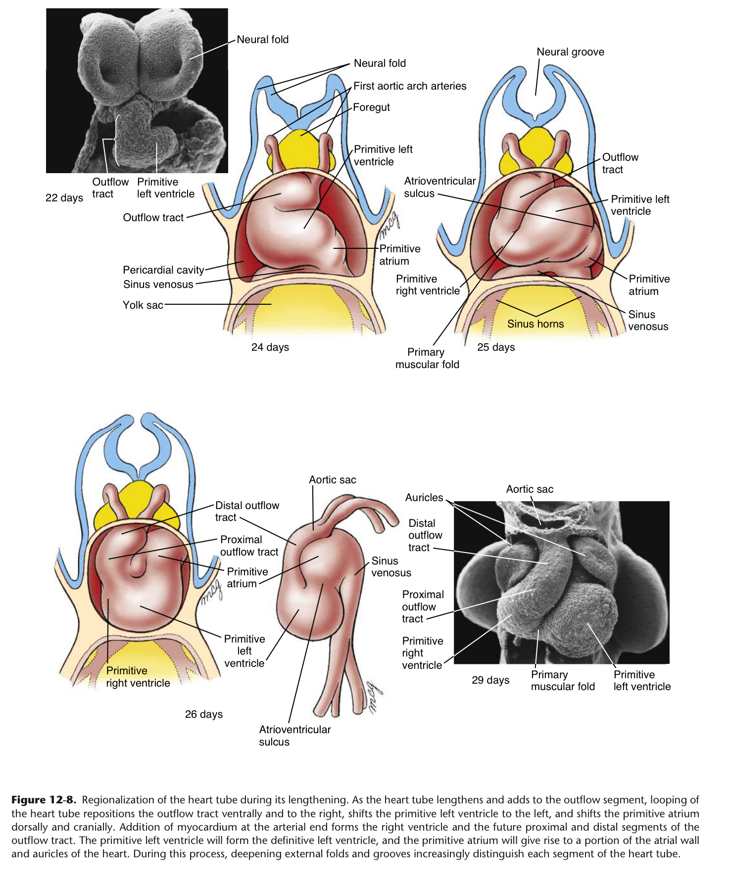 e of cardiac morphogenesis. Once the primitive heart tube is formed, a primitive venous pole on one end and an arterial pole on the other end are seen. Primitive regions along the heart tube include from caudal to rostral: sinus venosus, primitive atria, primitive ventricle, bulbus cordis (conus), and truncus arteriosus. The regions are separated by so-called transitional zones, which will later form the septa and valves. Two transitional zones are identifiable in this schematic: the atrioventricular ring (AVR) forming the future atrioventricular valves and the primary fold (PF) forming the future interventricular septum.