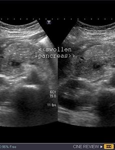 Acute pancreatitis Acute pancreatitis is sudden inflammation of the pancreas that may be mild or life threatening but usually subsides. Gallstones and alcohol abuse are the main causes of acute pancreatitis. Severe abdominal pain is the predominant symptom The pancreas is visualized nicely in the above ultrasound images and appears swollen, edematous and hypoechoic. These findings suggest acute pancreatitis. If le.. 2009. 9. 4. 이전 1 다음