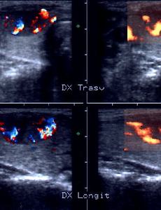 THYROID ADENOMA Woman, 32 y.o. Solitary nodule (mm 12x17x25) in the apex of the right lobe, hypoechoic, dishomogeneous owing to interior hyperechoid and hypoechoid areas; borders are regular. Colordoppler scan (left): rich internal vascularization, more evident in the powerdoppler scan (right) FNA: follicular neoplasm. Histological examination: microfollicular adenoma with trabecular aspects. Ultrasound tomogra.. 2009. 9. 21. 이전 1 다음